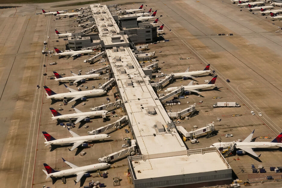 7月19日午前、アメリカン航空、デルタ航空、ユナイテッド航空など米大手航空会社の航空便が、通信上の問題のため、出発できない状態となっている。写真はデルタ航空の機体。4月、ジョージア州にあるハーツフィールド・ジャクソン・アトランタ国際空港で撮影(2024年 ロイター/Elizabeth Frantz)(ロイター)