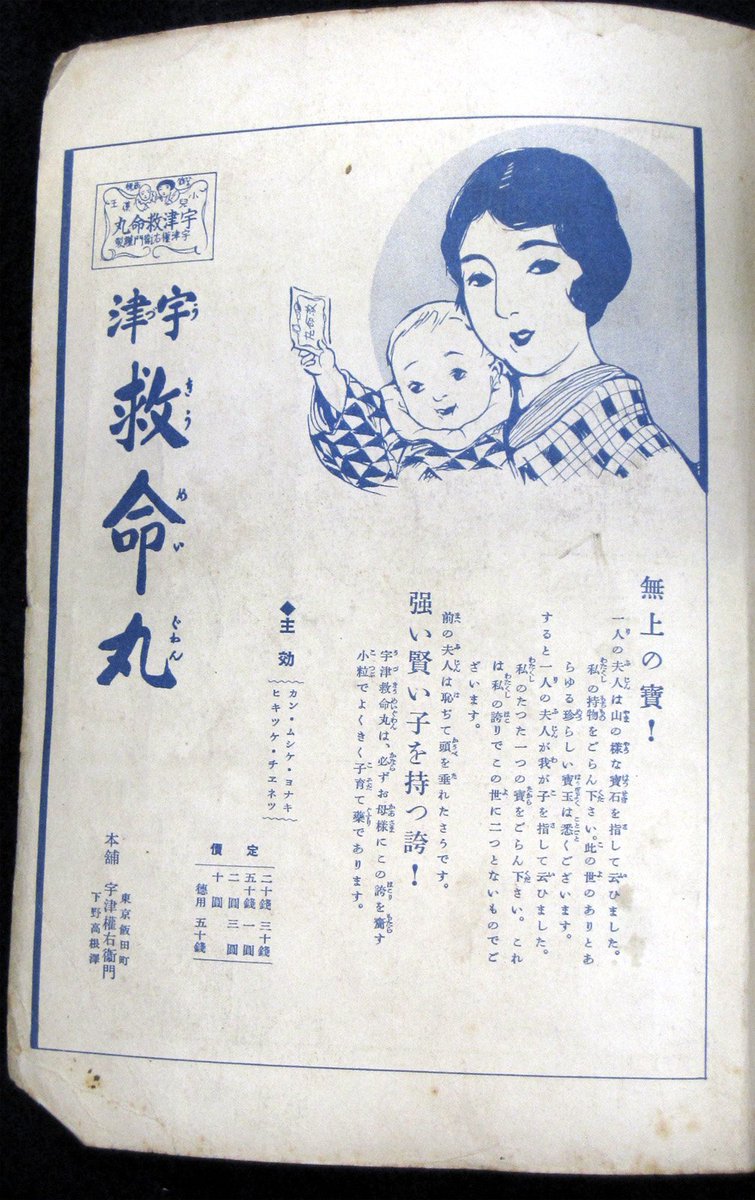 宇津救命丸の広告です。非常に歴史が古い薬で宇津権右衛門という人が1597年に創製したのが始まりだそうです。余談ですが東日本では 宇津救命丸、西日本では樋屋奇応丸と、乳幼児用医薬品の知名度が東西で分かれているようです