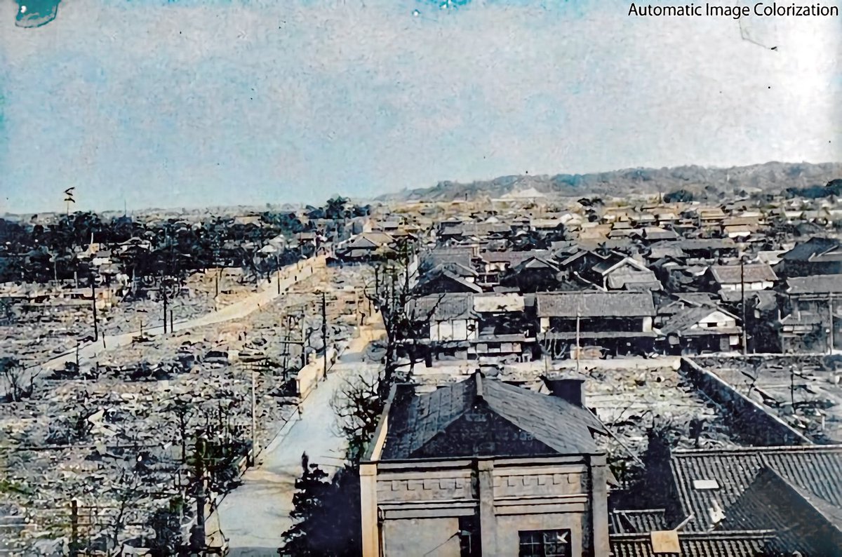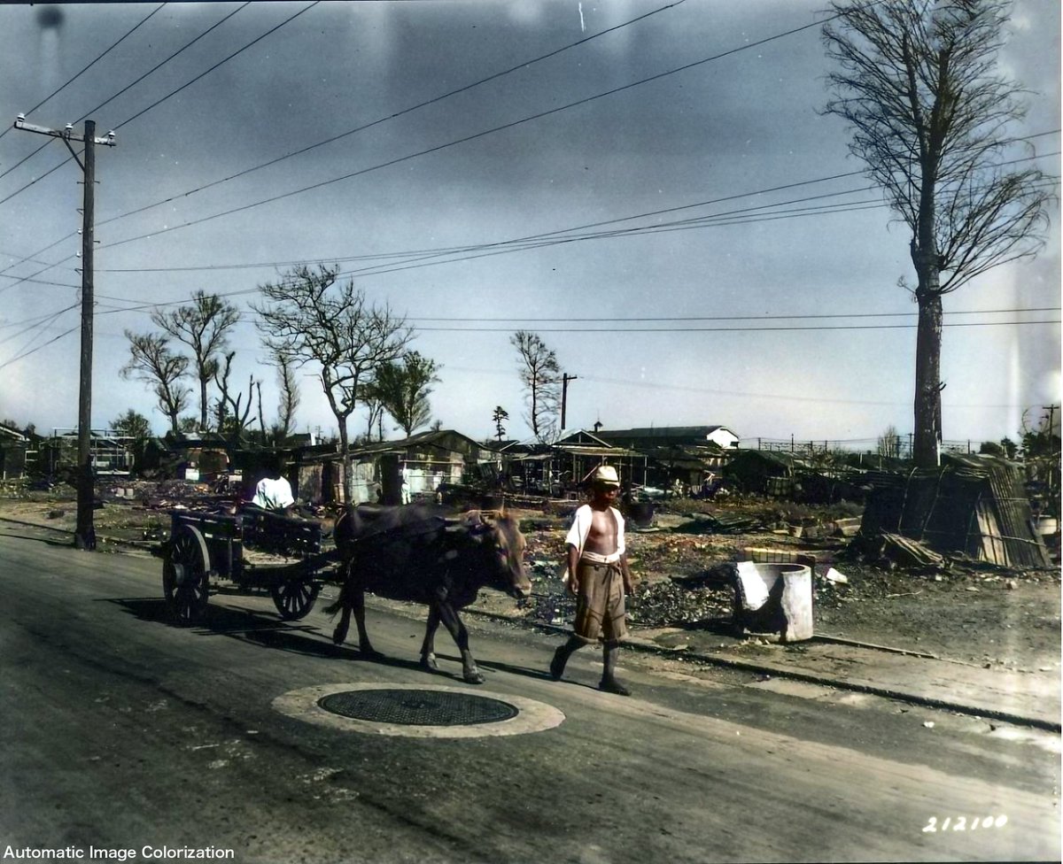 半焼家屋130戸に及び,10,730人が焼け出された。写真は焼け残ったトキハ百貨店から東をみたようす。