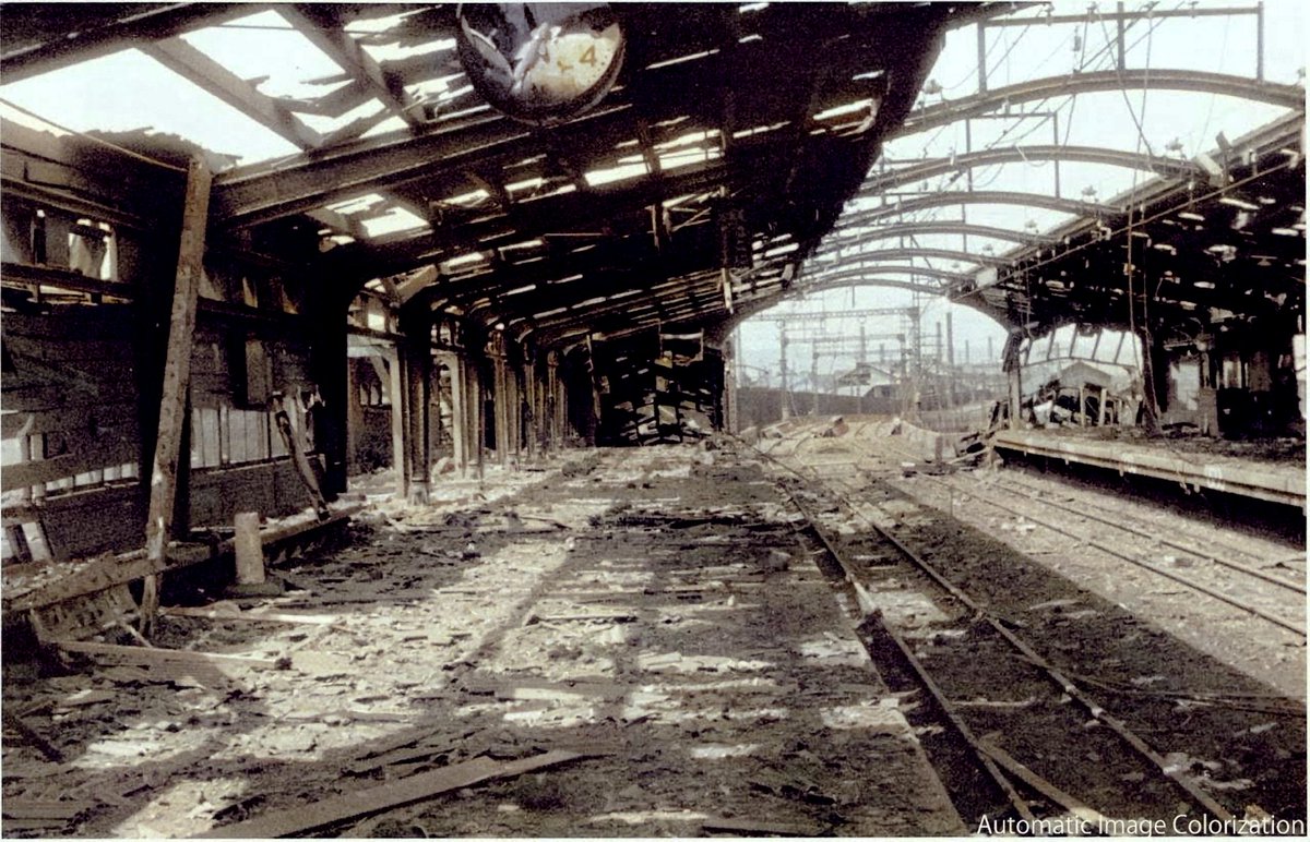 79年前の今日。1945年7月24日,第7回大阪大空襲。住友金属工場および大阪陸軍造兵廠が標的となった。写真は破壊された森ノ宮駅の構内。