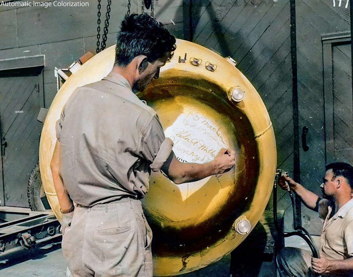 長崎原爆「ファットマン」にサインする,